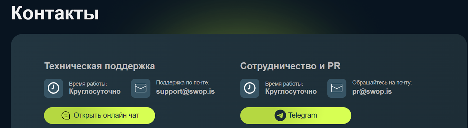 Тех поддержка на swop обменник доступна через онлайн-форму на сайте и по электронной почте support swop is.