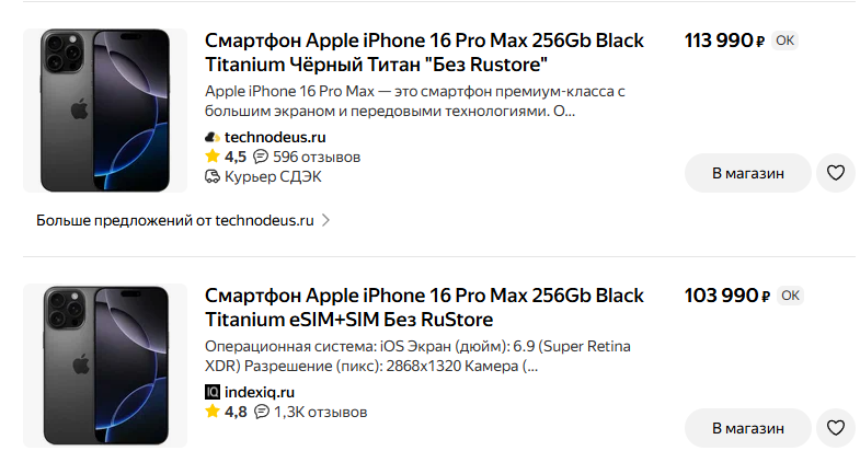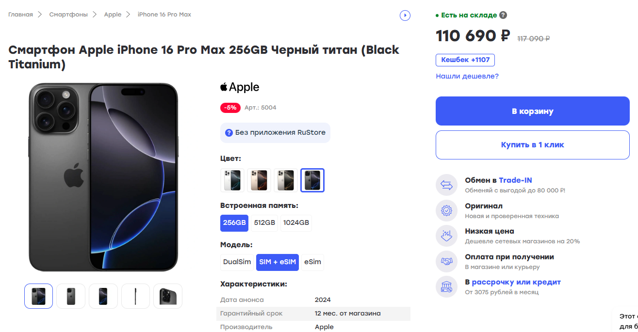 Пользователям предлагается техника и электроника от известных брендов. При этом указанные цены близки к среднерыночным. Так, например, Айфон 16 Про Макс с памятью на 256 Гб в интернет-магазине реализуется более, чем за 110 тысяч рублей.