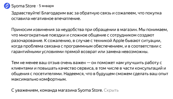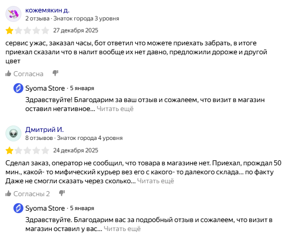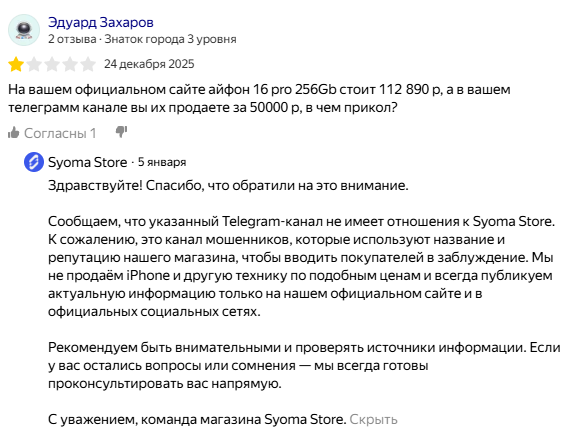 Есть и негативные отзывы на Syoma Store, связанные с фейковыми Телеграм-каналами от мошенников для развода и обмана аудитории. Представители магазина сразу отметили, что у проекта есть клоны, важно ориентироваться только на официальные сервисы.