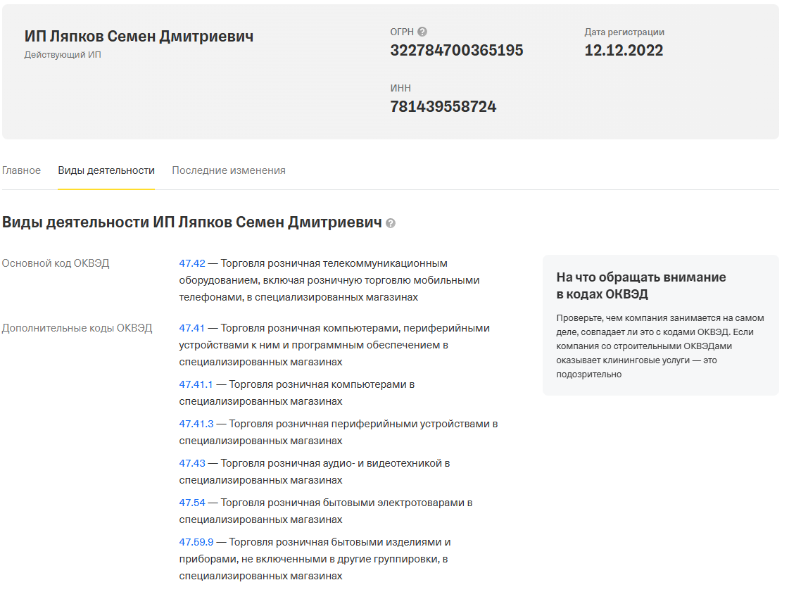 Магазин зарегистрирован на ИП Ляпкова Семена Дмитриевича. У предпринимателя есть необходимые ОКВЭД для работы, зарегистрирован бизнесмен также в Санкт-Петербурге.
