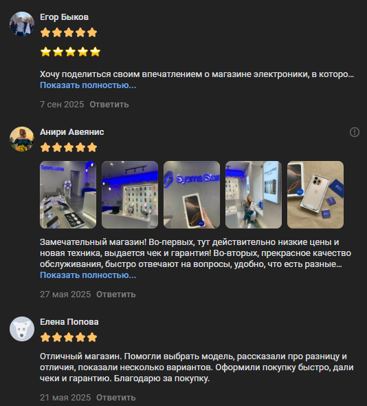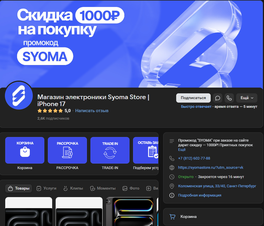 В социальных сетях магазина электроники SyomaStore комментарии ограничены, при этом в ВК открыт раздел для оценок и там покупатели могут делиться отзывами. У сообщества в ВК довольно высокий рейтинг – 5 из 5.