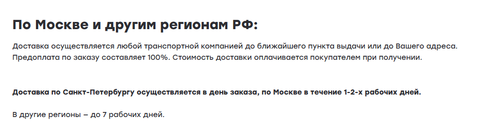 На сайте отмечено, что купить товары можно с доставкой, но при этом стоимость доставки рассчитывается отдельно и требуется стопроцентная предоплата.
