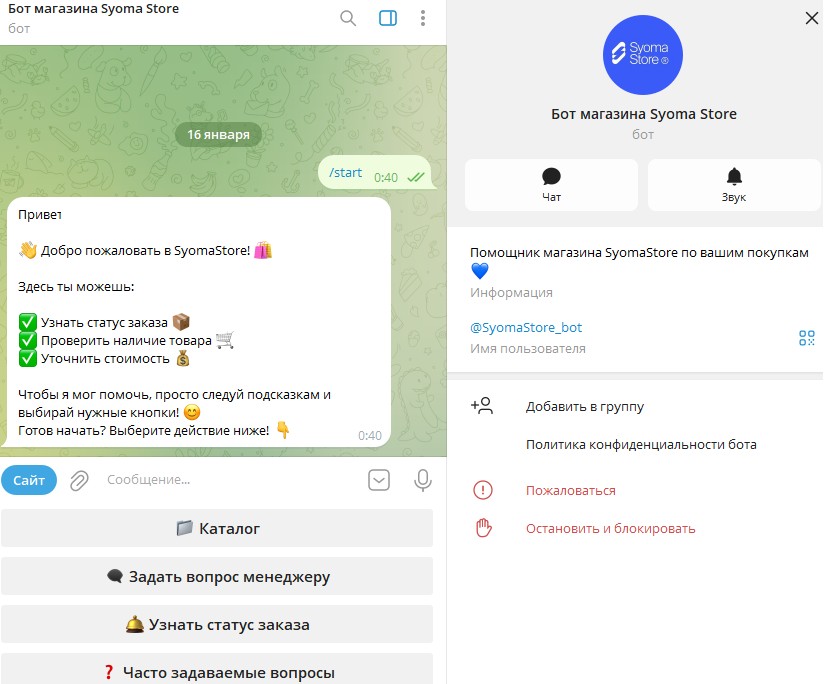 Дополнительно пользователям Syoma Store предлагается покупать телефоны и другую технику через Телеграм-бота. Но он просто синхронизирован с онлайн-каталогом сайта, поэтому это мало чем отличается от обычной покупки на сайте.