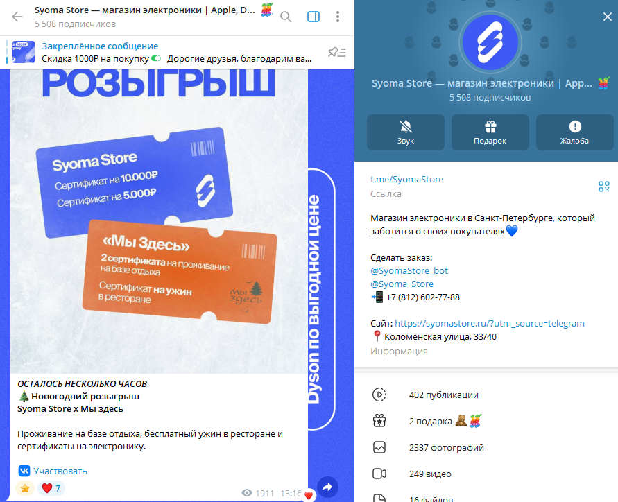 У магазина Syoma Store есть аккаунты в различных социальных сетях, Телеграмм-канал – одна из наиболее многочисленных. На страницу подписано более 5,5 тысяч пользователей.