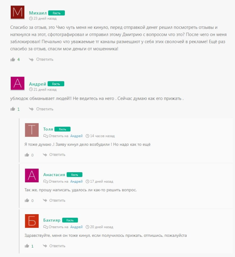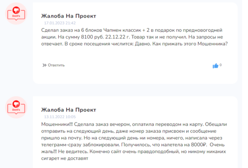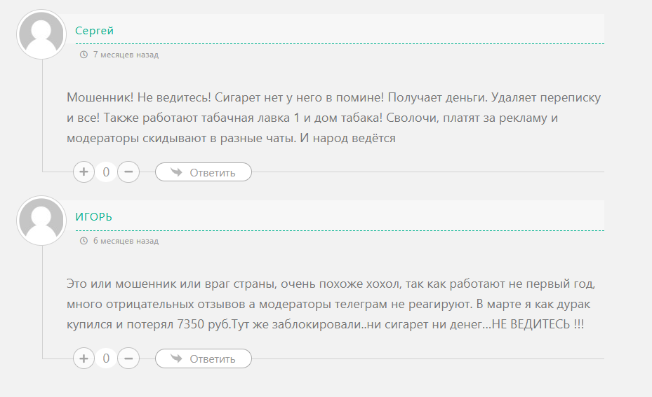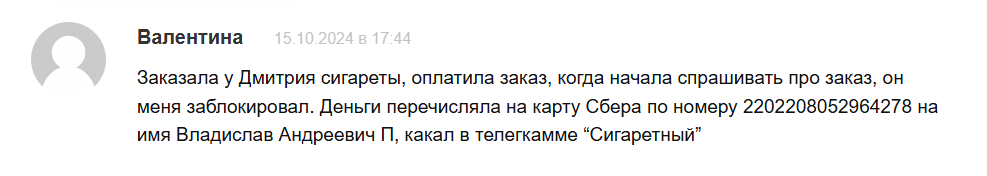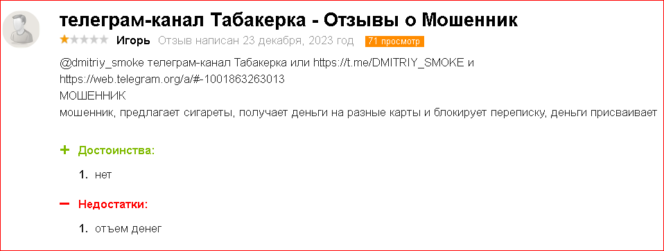 В сети большое количество негативных комментариев о ТГ Табакерка. Владелец канала использует банальную схему развода. Рекламирует сигареты по заведомо низким ценам, что привлекает клиентов. Минимальная сумма чека в заказе будет превышать 2,5 тысячи рублей. Подписчик пишет о намерении приобрести товар, ему выдают реквизиты карты третьего лица без всяких объяснений. Когда клиент оплачивает заказ, его блокируют, удаляют переписку, переименовывают аккаунт Дмитрия. Вернуть деньги нельзя, так как заказчику не предоставляют чеков, не подписывают с ним каких-либо документов.