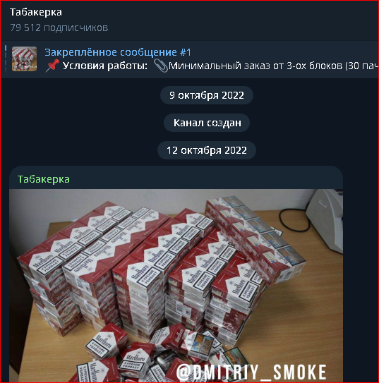 Телеграм Табакерка начал работу в октябре 2022 года. За этот период автор успел накрутить аудиторию до 80 тысяч подписчиков, однако просмотры выдают манипуляции, они скачут от 6 до 150 тысяч. Контент состоит из описания товаров и условий сотрудничества. Автор работает по предоплате, поставляет продукцию мелким и крупным оптом без договора и чеков. Не указаны реквизиты ИП или компании, но пользователей Дмитрий Смок уверяет в подлинности сигарет, наличии акцизов и быстрой доставке.