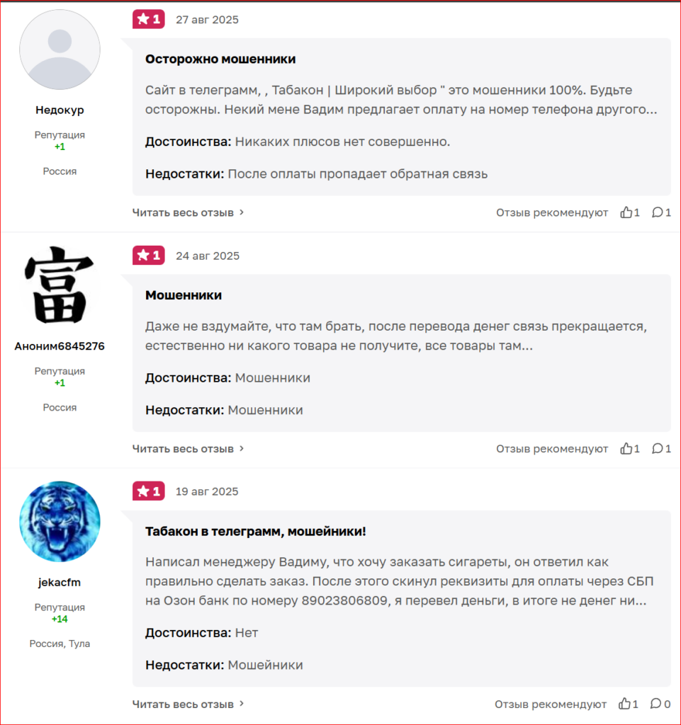 На момент сбора данных независимых отзывов о Табакон в телеграм на крупных площадках мало. Внутри канала присутствуют скрины с благодарностями, но идентифицировать реальные независимые площадки с отзывами сложно.