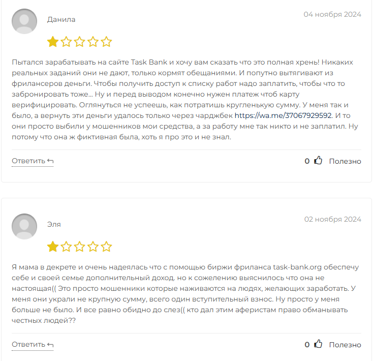 Настоящие отзывы о Таск Банк можно найти на сторонних независимых ресурсах. Здесь картина абсолютно другая, никто не оценил проект даже и на 2 звезды. В этих комментариях раскрывается еще один обман данных мошенников: перед выводом они просят внести вступительный взнос, с которым и пропадают. Хотя, вероятно, с таким маленьким количеством заданий до вывода дело мало у кого дойдет.