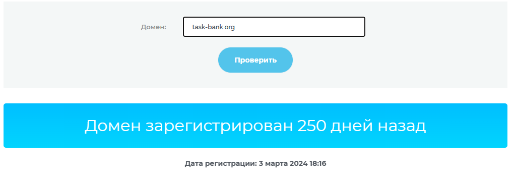 Первое, о чем стоит упомянуть, – возраст сайта. Слишком молодые проекты должны вызывать подозрения, так и в случае с task bank org, домен которого был зарегистрирован только в этом году. Этот факт стоит учитывать первым при оценке рисков.
