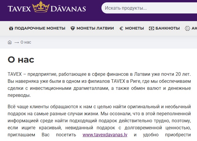 Стоит начать с того, что данная компания ведет свою деятельность сразу через несколько официальных сайтов. В большинстве случаев площадки отличаются значением домена, присвоенного той или иной стране. Во владении проекта есть tavex dk, tavexdavanas lv, tavex eu, tavex lt, tavex fi и даже tavex latvia.