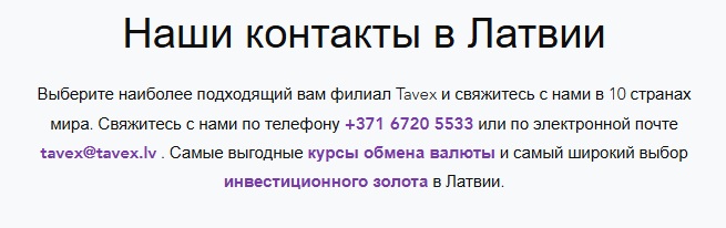 Также фирма предлагает возможность обмена валюты на выгодных условиях, включающих низкие комиссии и эффективную техподдержку. Курс валют предоставлен на сайте tavex lv и других площадках проекта.