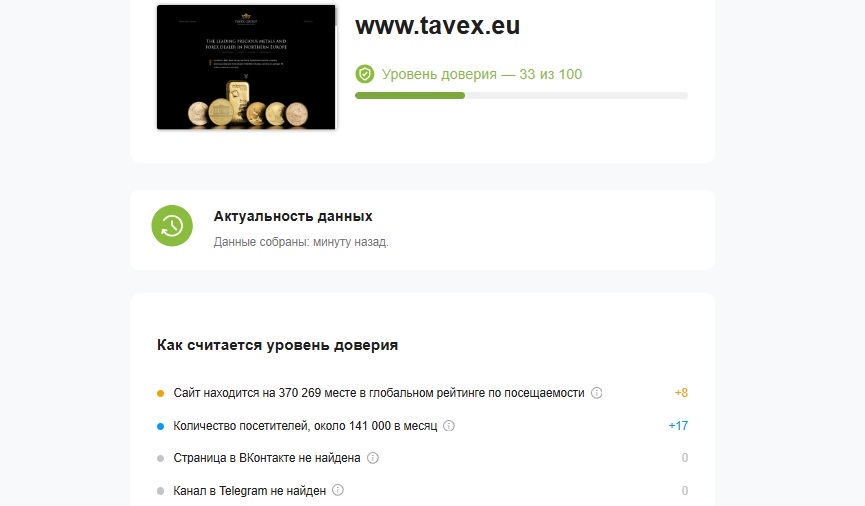 Дальнейшая проверка доменов была выполнена с помощью сервиса, определяющего реальную репутацию сайтов. Оказалось, что рейтинг доверия у проекта TavexLatvia довольно низкий и составляет всего 33 балла из 100 возможных.