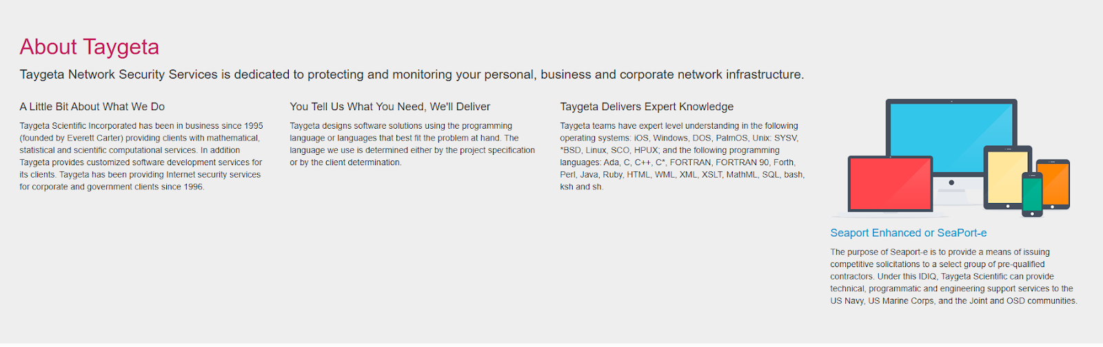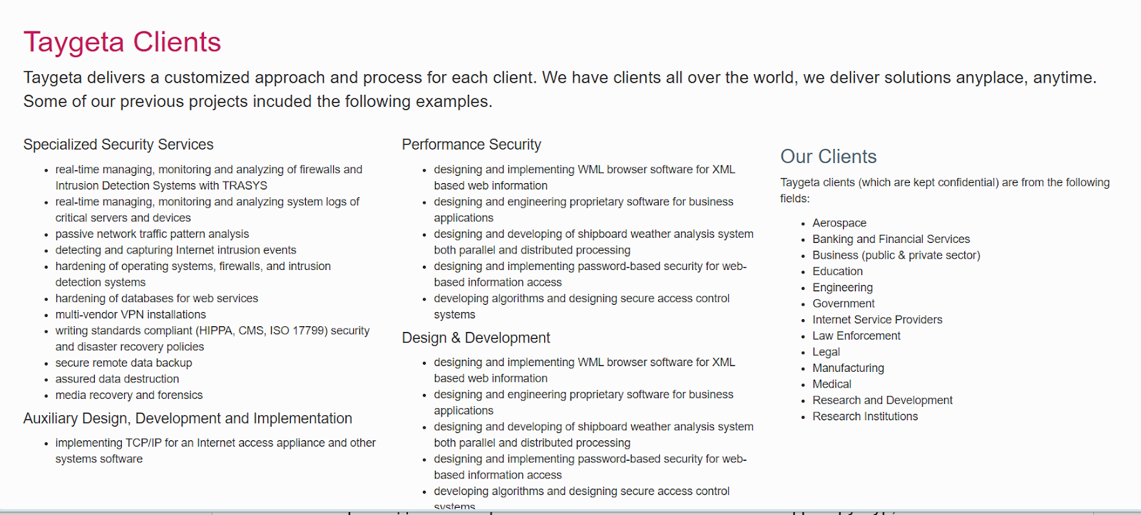 По официальным данным сайта, Taygeta уже почти три десятилетия занимается наукоемкими вычислениями, кибербезопасностью, кастомным софтом и сопровождением критически важных сетевых инфраструктур, включая государственные структуры, военных и корпоративных гигантов.