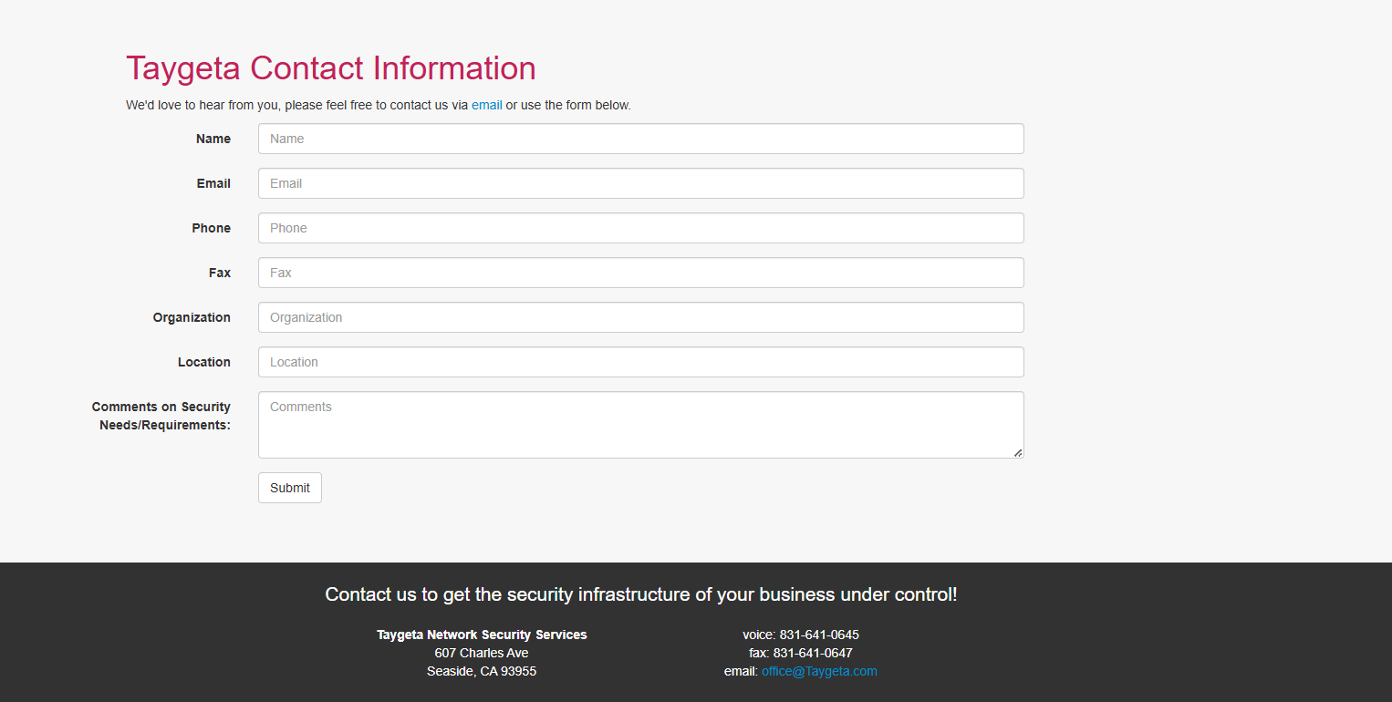 Однако на практике все прозаичней. Позиционирование компании в сети ограничивается названием Taygeta Network Security Services, почтовым адресом в Калифорнии — 607 Charles Ave, Seaside, CA 93955, а также контактами и почтой office Taygeta com.
