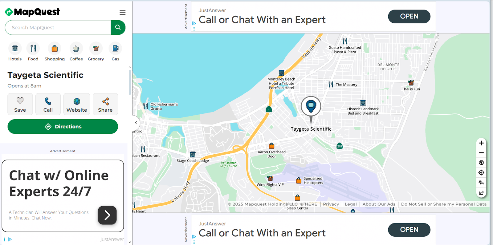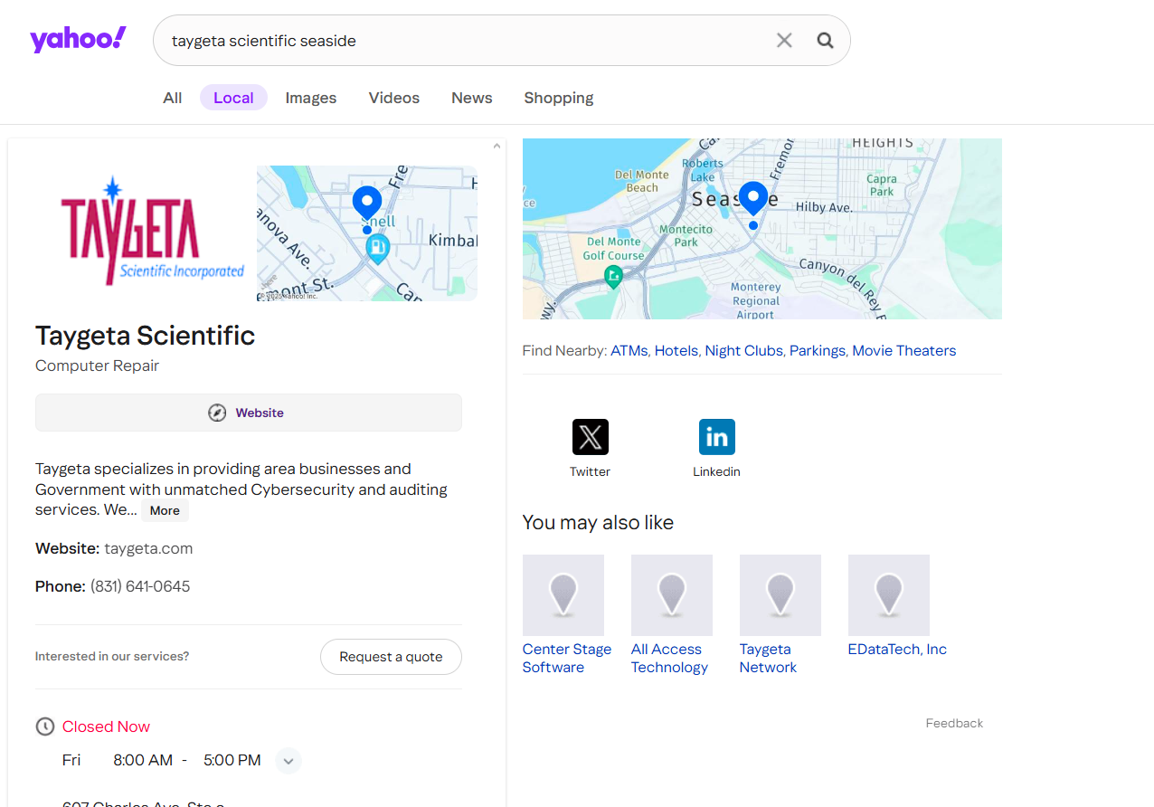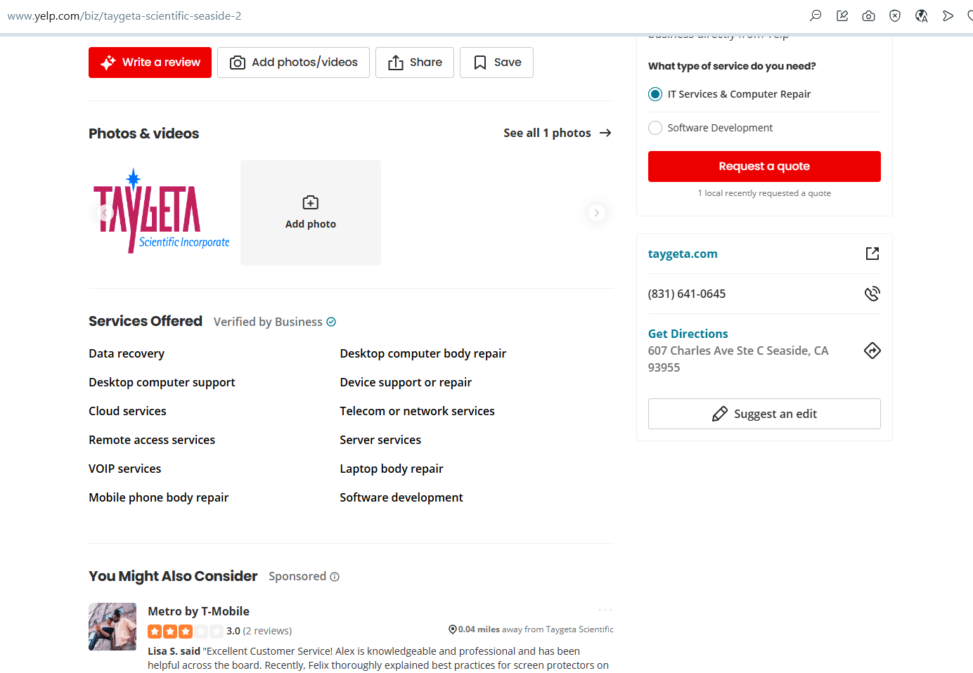 Единственное упоминание встречается на локальных бизнес-страницах: на Yelp компания появляется как Taygeta Scientific по адресу 607 Charles Ave, Ste C, Seaside, CA, но реальных откликов там нет.