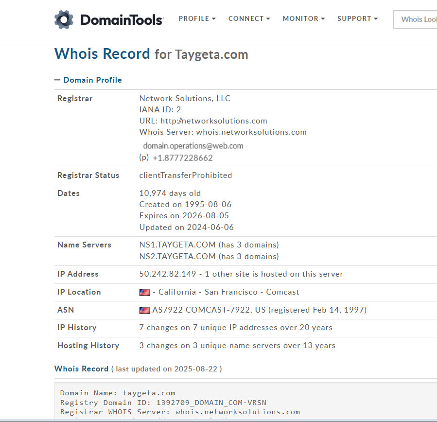 Домен компании действительно старый: зарегистрирован еще 6 августа 1995 г. через регистратор Network Solutions, LLC. Whois показывает, что серверы компании работают на ns1 Taygeta Com и ns2 Taygeta Com, а IP принадлежит калифорнийскому сегменту Comcast (ASN7922).