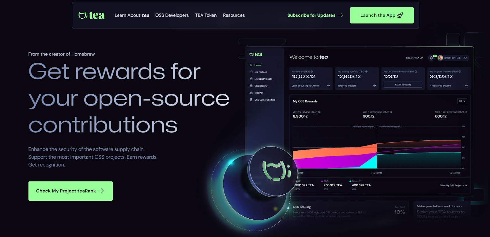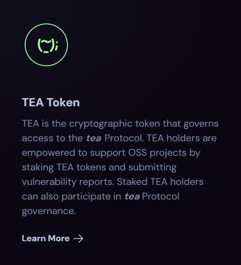 Но денежная выгода здесь не только у разработчиков, но и у держателей токена TEA, который имеет базу ERC-20. Основной способ поддержки разработчиков с обратной выгодой – отправлять токены в стейкинг на конкретный проект. В теории, если проект оправдает ожидания и станет популярным, то количество коинов будет увеличиваться, а его цена расти. Владельцы TEA могут вносить свой вклад в безопасность цепочки поставок ПО, отправляя соответствующие отчёты о дырах, багах и пр. Все действия будут выполняться в отдельном приложении – app tea xyz.