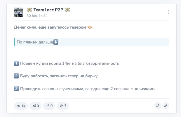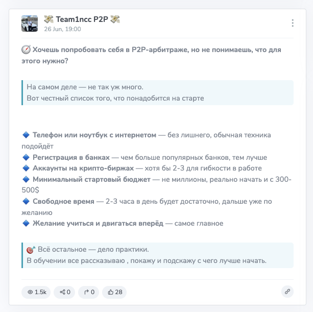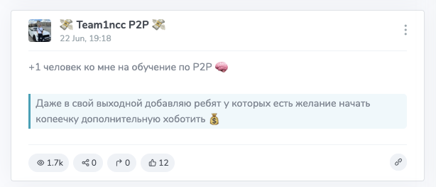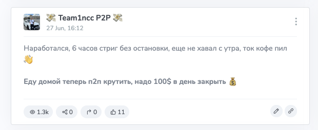 На телеграмм-канал Team1ncc P2P, на 1 июля 2025-го года, подписано около 17,5 тысяч пользователей. Однако, публикации в ленте этого аккаунта просматривают в среднем всего по 1-1,5 тысяч раз.