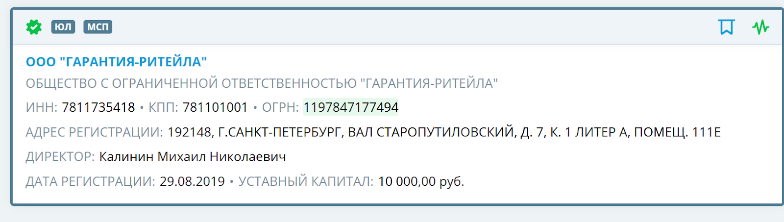 Проверка показала, что магазин работает под управлением “ООО Гарантия-Ритейла”. Фирма зарегистрирована в Санкт-Петербурге и имеет директора Калинина Михаила Николаевича. Уставной капитала организации небольшой и составляет всего 10 тыс. рублей. Такая сумма свидетельствует о несерьезности организации, и невозможности компенсировать потери клиентов в случае обмана.