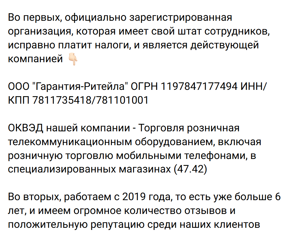 В описании говорится, что все заказы с ценой от 25 тыс. рублей проходят с оформлением договора. Это подтверждает честность сделки и гарантированное получение покупаемого товара. В описании говорится, что компания работает легально. Также в одной из публикаций приводятся все данные юридического лица.