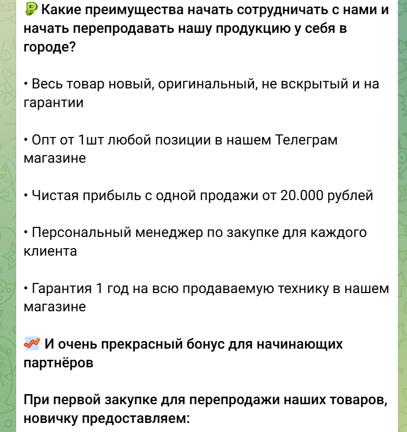 В описании говорится, что Технику из Европы в Телеграмме можно заказать с доставкой в разные страны. При этом товар отправляется со складов самых разных стран. Низкая цена объясняется ввозом продукции по параллельному импорту, что исключает декларирование на таможне. Дополнительным плюсом является наличие собственных поставщиков.