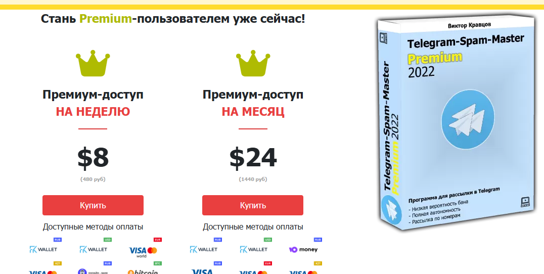Оплата возможна через FKWallet, Ю Money, банковские карты и криптовалюту (BTC, LTC, ETH, USDT, TON, BNB, TRX). Обычная версия ограничивает объем получателей рассылки, участников парсинга и частоту использования функционала.