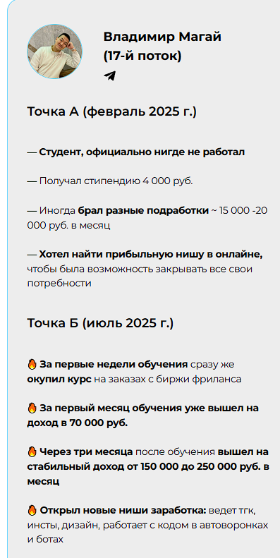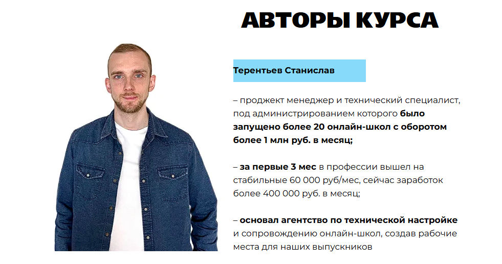 Сооснователь школы – Станислав Терентьев, он – проджект-менеджер и технический специалист, а также наставник на некоторых курсах. О себе Стас пишет, что запустил более 20 онлайн-школ с миллионными оборотами и основал агентство по техническому сопровождению. Сейчас заработок специалиста – более 400к рублей/мес.