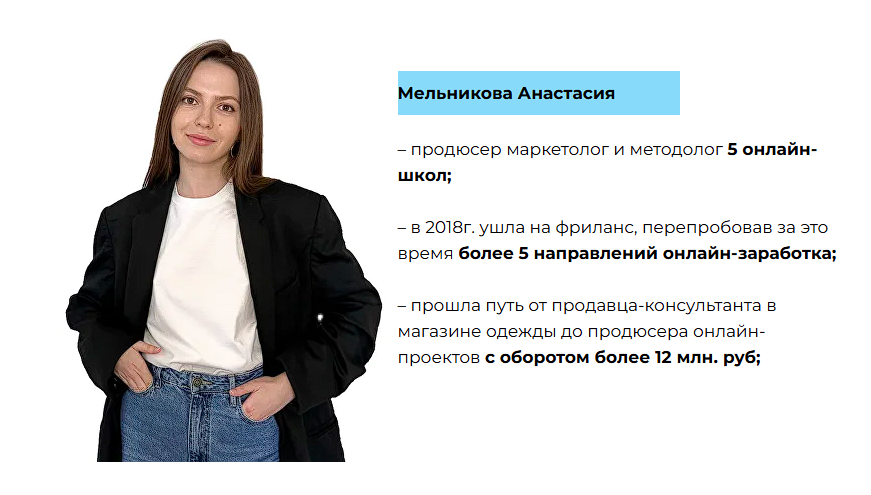 Настя Мельникова отвечает за продюсирование, маркетинг и методологию. Она – вроде проводника в профессию: объясняет ученикам структуру запусков, работу с клиентами, психологические барьеры и стратегию выхода на доход. В фрилансе Анастасия – с 2018 года.