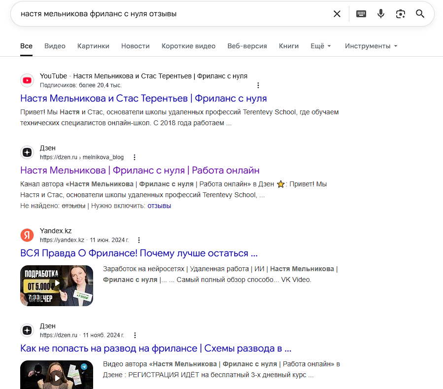 В независимых источниках отзывов о Terentevy School практически нет. Люди не обсуждают проект на форумах и не делятся опытом на отзовиках, хотя на канале Стаса и Насти с отзывами – почти 2000 скринов. Если прогуглить запрос вроде «настя мельникова фриланс с нуля отзывы», выдает ссылки на собственные ресурсы авторов.