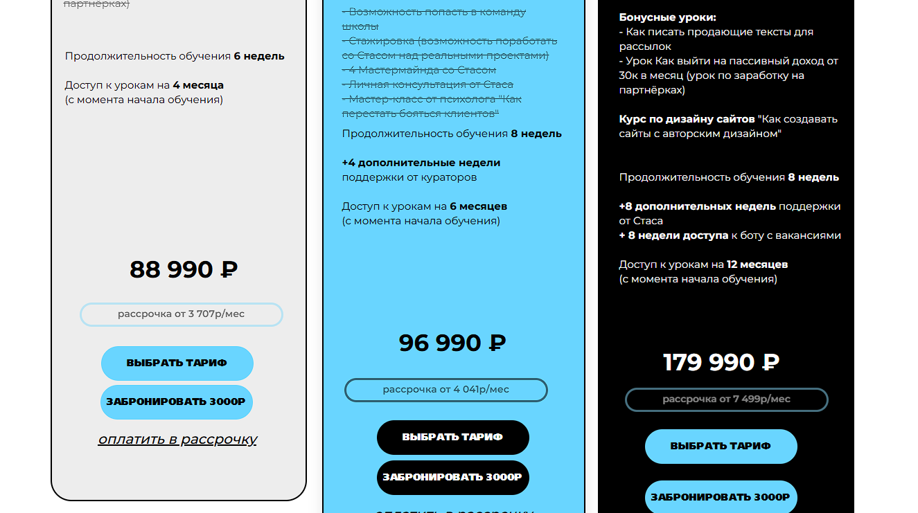 Основная задача курса – привести новоиспеченного специалиста к доходу от 90 000 рублей в месяц за 4-5 мес. Заплатить за это надо от 89990 до 179990 рублей, для всех вариантов доступна рассрочка: