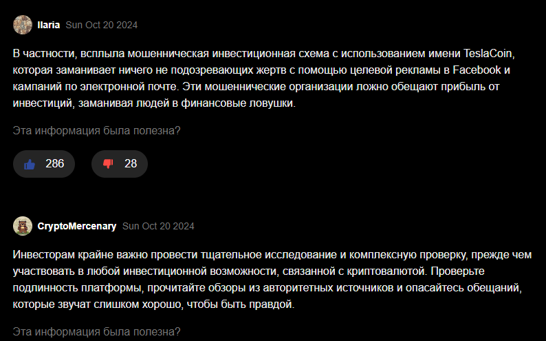 Почти все реальные пользователи говорят, что крипта Тесла коин — классический обман. Создатели используют имя хорошо знакомого бренда, чтобы заманить новичков. Схему используют во второй раз, так что достаточно посмотреть прошлые посты о монете и можно будет все понять.