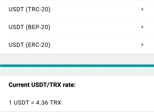 Откроется приложение, в котором нужно будет выбрать необходимую сеть, например, TRX-20. Также внизу указывается текущий курс валют.