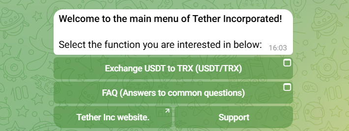 Если во время обмена возникнут вопросы, можно обратиться в техподдержку. Для этого необходимо нажать на соответствующую кнопку. После чего пользователя перекинет в Tether Support. Чтобы написать обращение по поводу проблемы, достаточно запустить бота кнопкой Start и написать свою проблему.