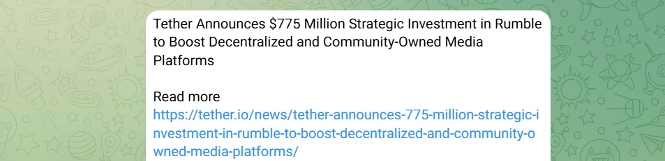 У компанит Official Tether есть собственный телеграмм, где разработчики публикуют новости проекта. Например, здесь написано, что Tether Operations Limited инвестировали $775 млн. в Rumbler.