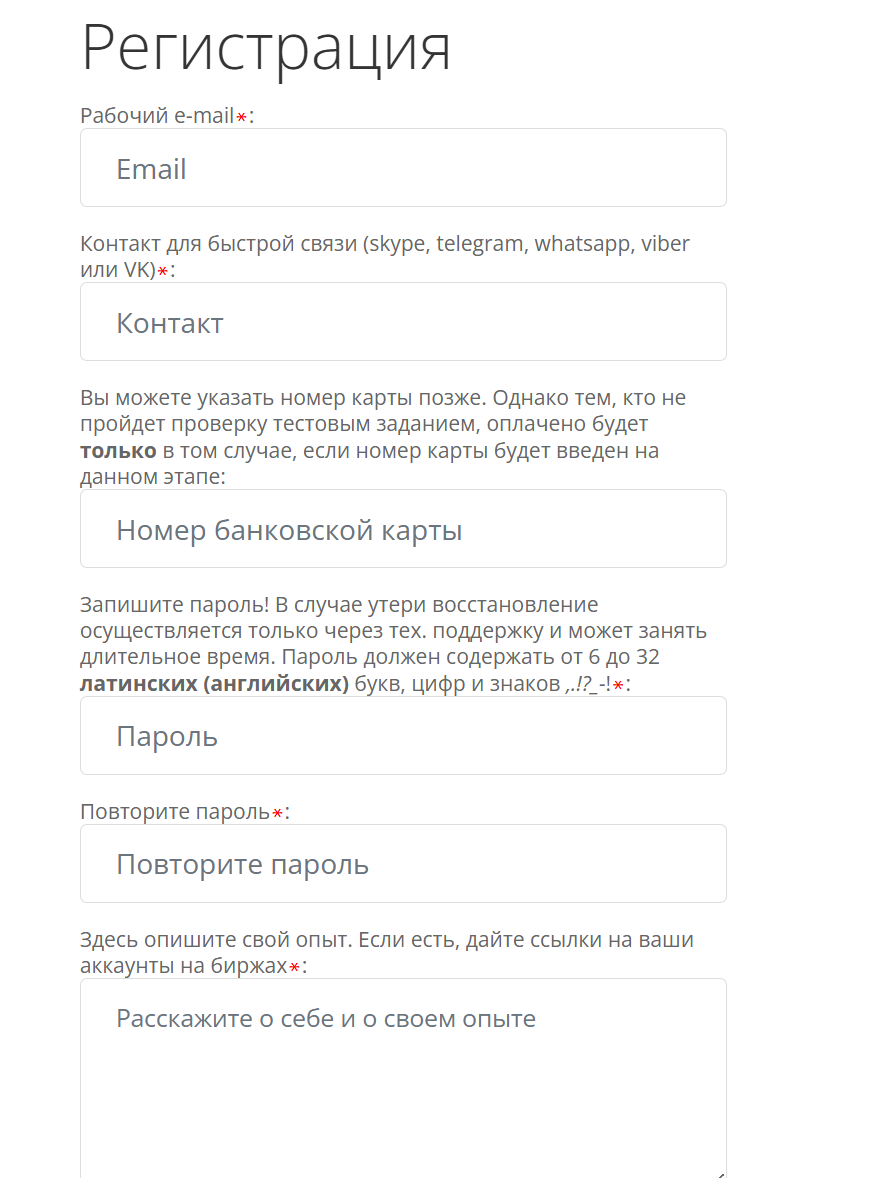 Для подключения к платформе необходимо перейти по ссылке textox ru /account/register и пройти регистрацию. На данном этапе пользователям предлагают электронную почту и контакт. Также требуется указание номера карты и пароля. Обязательно стоит рассказать о себе и своих навыках.