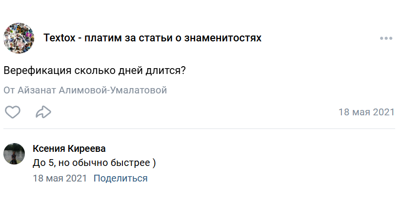 Для изучения отзывов о проекте можно подписаться к каналу в ВК. Он называется Textox платим за статьи о знаменитостях. Здесь подписчикам предлагают подключиться к платформе и начать зарабатывать. При этом последняя запись сделана еще 24 февраля 2024-го. Здесь пользователи спрашивают об удалении аккаунта, времени прохождения верификации и прочих моментах.