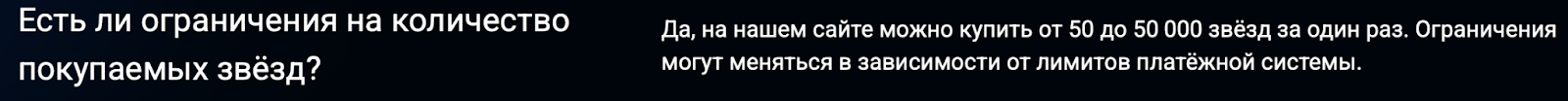 За один «заход» можно приобрести до 50 тысяч звезд, но данный лимит может меняться в зависимости от типа платежной системы.