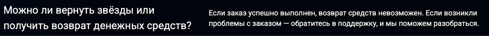 Для совершения покупки достаточно выполнить несколько простых действий: указать юзернейм телеграм в заявке, выбрать услугу и оплатить ее. На сайте сказано, что купленные звезды начисляются в «считанные минуты», однако в разделе Q&A есть уточнение: процесс может растянуться на двое суток. На наш взгляд, разница между «несколькими минутами» и «до 48 часов» внушительна. В других разделах сайта формулировка еще более размытая: якобы времени на обработку заявки может уйти больше из-за «нагрузок на сервер».