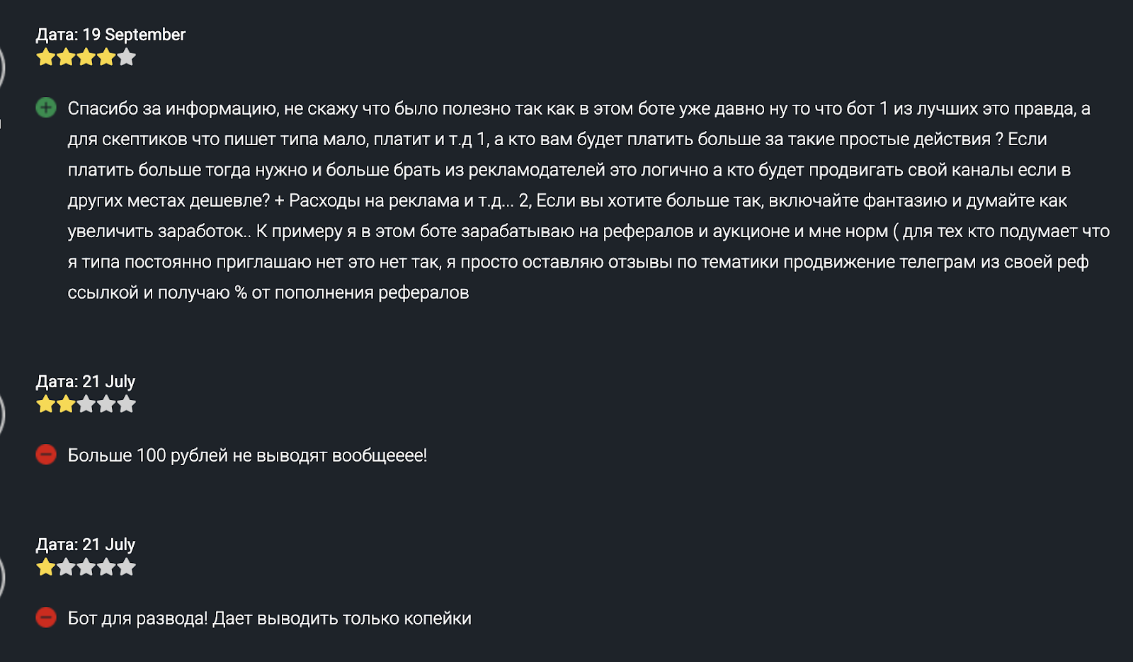 На просторах интернета можно увидеть самые разные отзывы о проекте: как положительные комментарии, так и негатив. Часть юзеров утверждает, что бот стабильно платит за задания и позволяет получать доп доход. Другая же часть заявляет, что больше 100 рублей вы оттуда не выведите и что это все развод.