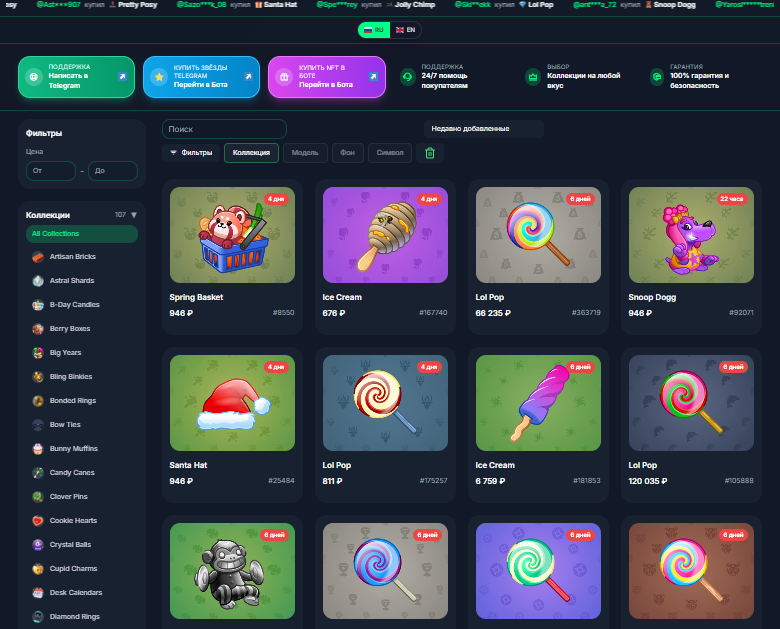 На площадке Tgsupergift com презентуется коллекции по категориям. Автоматическая сортировка показывает пользователю на главной странице недавно добавленные гифты. Можно установить показ по цене и NFT, которые скоро закончатся. Интерфейс представлен на русском и английском языках.