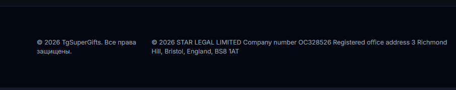 Название компании и адрес, указанные в футере проекта, найдены в каталогах английских юридических фирм. Разработчики платформы взяли подходящее название из зарубежного реестра наугад. Никакой связи организации, предоставляющей услуги юристов в Британии, и порталом по продаже Telegram подарков нет.