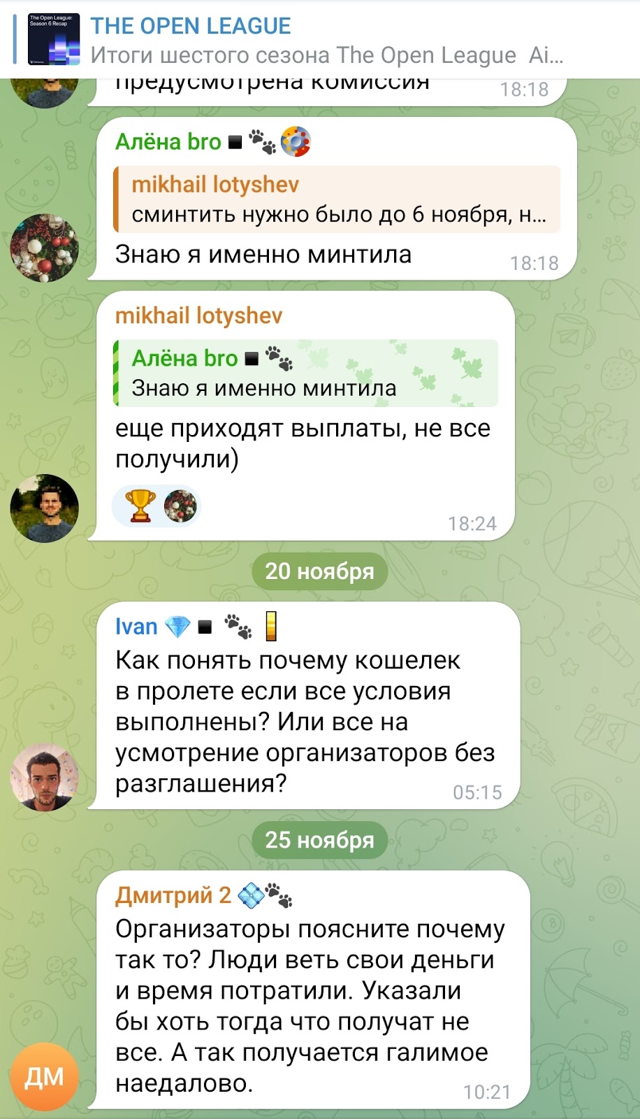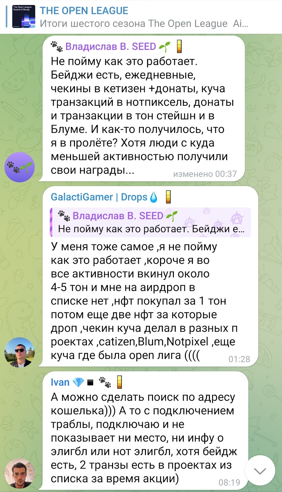 Для увеличения рейтинга и шансов получить аирдроп, пользователи зарабатывали баллы за взаимодействие с проектами, предоставляя ликвидность и торгуя активами. За своим рейтингом в реальном времени можно следить в The Open League бот.The Open League Отзывы пользователей о возможности заработка