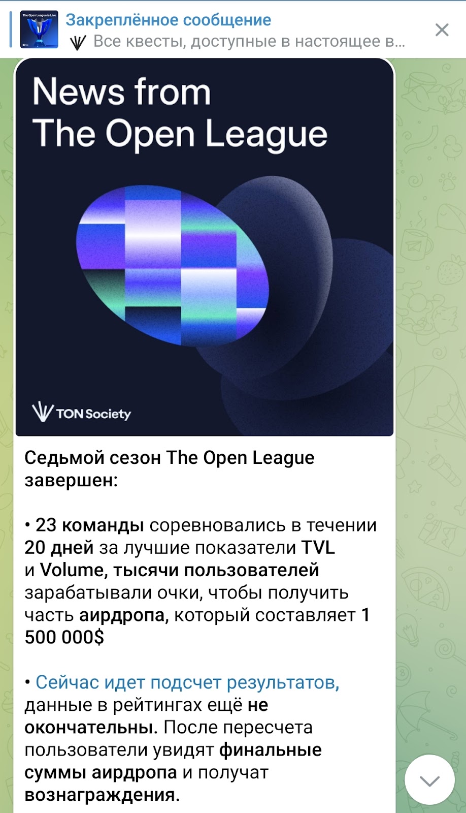 17 декабря закончился седьмой The Open League New Year сезон, который длился 20 дней. На момент написания статьи, команда проекта ведет подсчет результатов и составление рейтингов. После пересчета, участники увидят финальные суммы The Open League New Year airdrop и смогут получить вознаграждения.