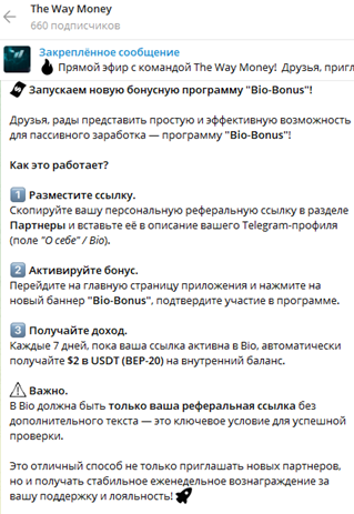 Thewaymoneybot – это новый инвестиционный проект, который работает на платформе соцсети Телеграм. В его рамках пользователи могут вложить средства под процент, а также зарабатывать на выполнении заданий и привлечении рефералов. Какова реальная прибыли и стоит ли тратить свое время на проект, расскажем в обзоре.