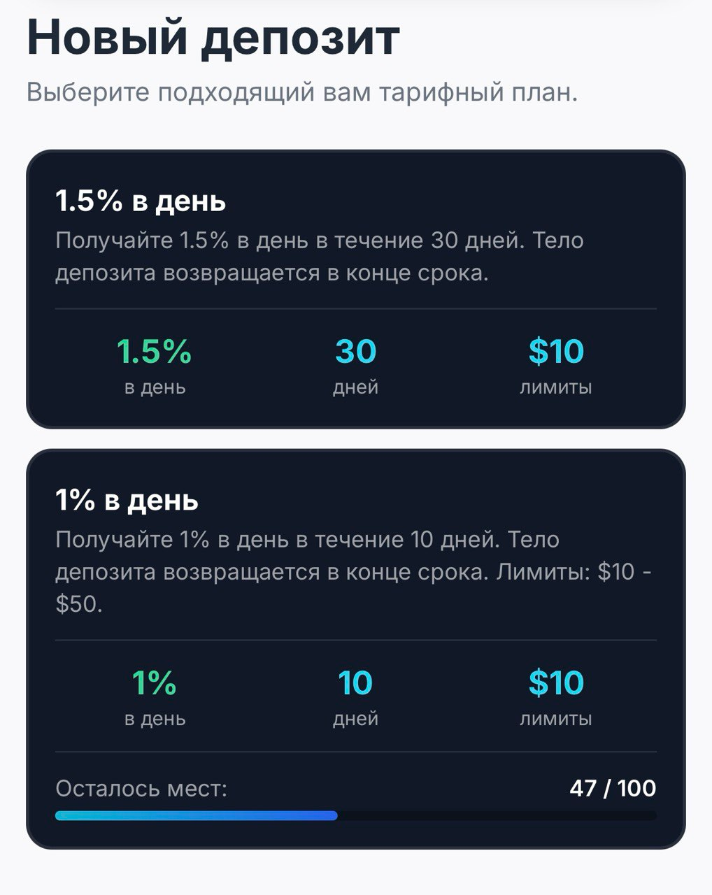 Для инвесторов предусмотрено два тарифных плана. Если разместить средства на 30 дней, то прибыль составит 1,5%, на 10 дней – 1%. Но последний тарифный план подразумевает лимит до 50 долларов.