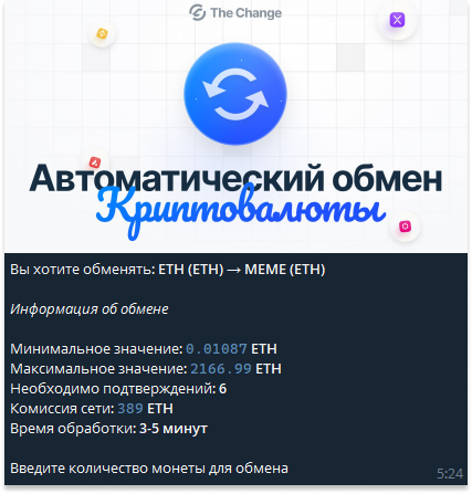 Если подводит интернет или по каким-то причинам зайти в браузер не получается, обмен можно произвести через бот thechange robot. Функционал тот же, процесс менее удобный и более медленный.