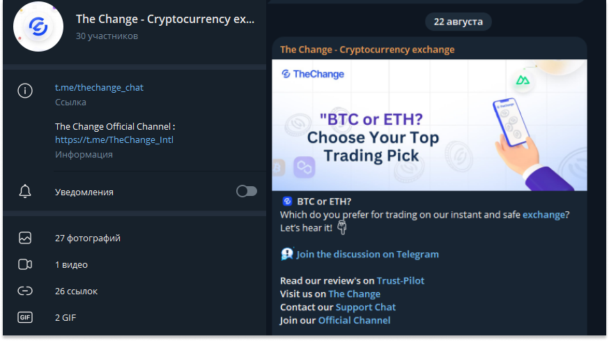 Чат thechange chat предсказуемо нужен для общения подписчиков и пользователей сервиса. Сообщество The Change Cryptocurrency exchange community на данный момент не развито: юзеры не общаются, а весь диалог строится на дублировании новостей из новостного канала.