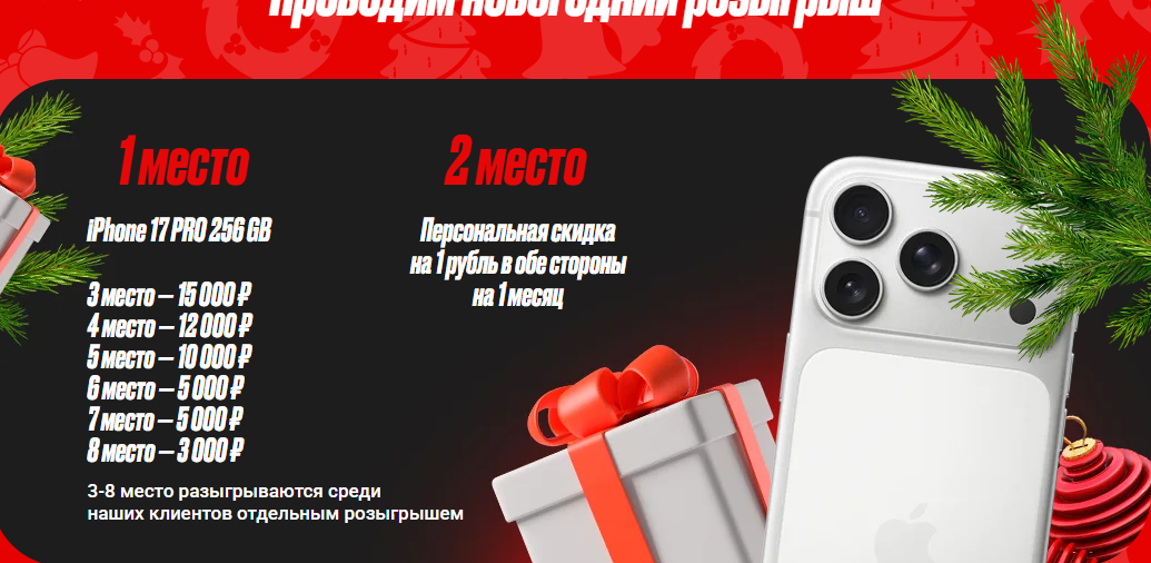Сейчас проводится новогодний розыгрыш призов. Главный приз iPhone 17 PRO на 256 гигабайт. Второе место получит скидку на рубль в обе стороны на месяц. Места с третьего по восьмое разыгрывают денежные призы от 3 до 15 тысяч рублей.