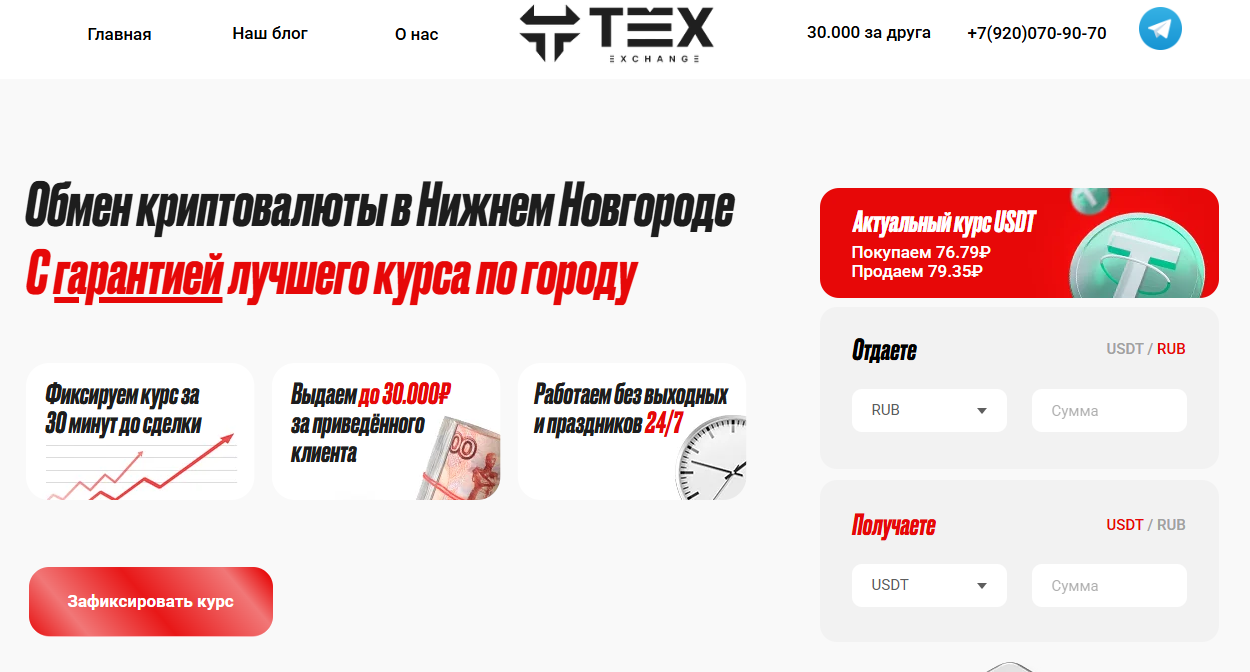 Проект обещает лучший курс по Нижнему Новгороду. Если клиент найдет у конкурентов выгоднее предложение, обменник готов перебить цену. Достаточно прислать скриншот или ссылку Manager TEX НН.