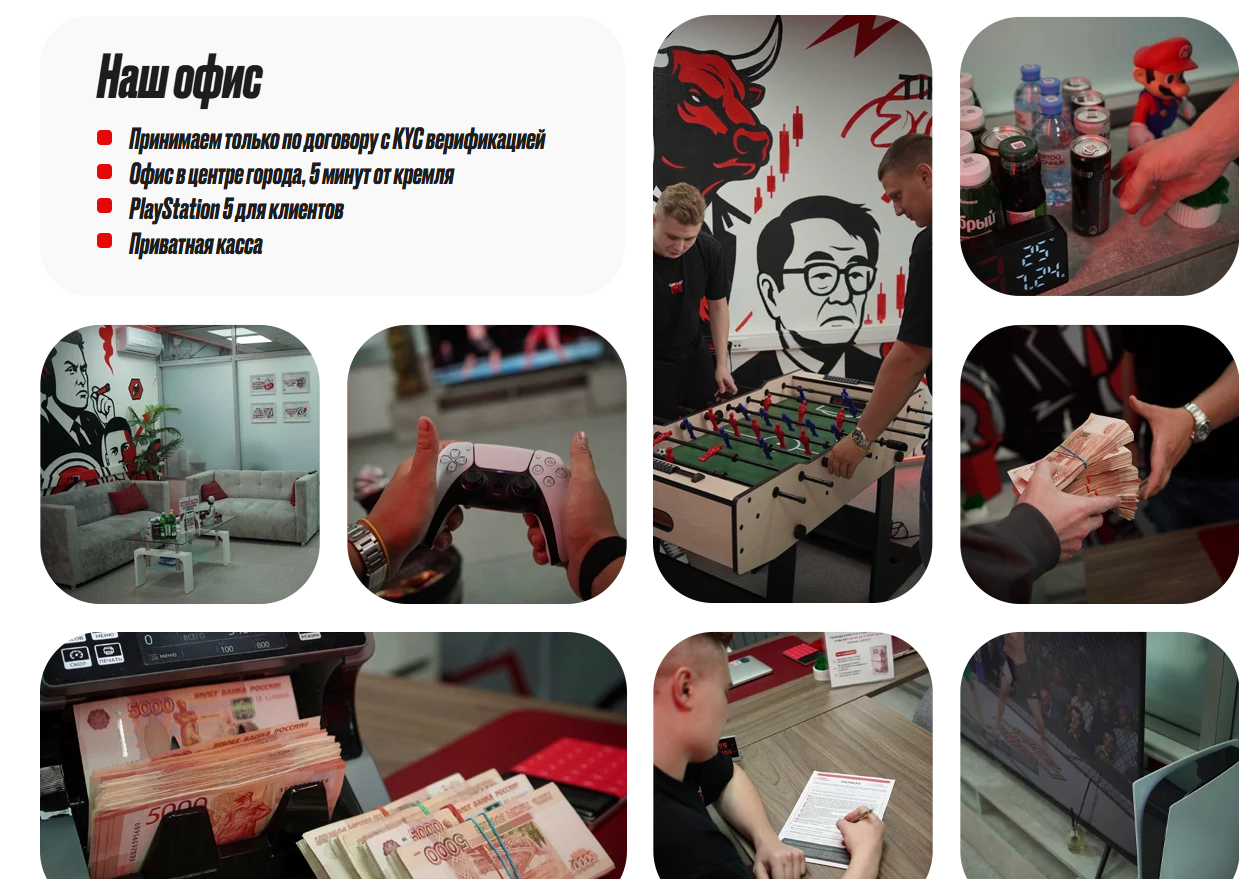 На сайте много фотографий офиса. Видно современный ремонт и игровую зону. Есть PlayStation 5 для ожидающих клиентов. Показана приватная касса для проведения операций. Стол с бесплатными напитками.Работает партнерская программа. За каждого приведенного друга платят до 30 тысяч рублей. Сумма зависит от объема сделок по таблице прогрессии. Выплату можно получить на карту или в USDT.